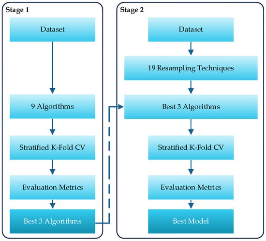 This paper proposes an advanced approach in terms of choosing the best machine learning algorithm in combination with the best resampling technique. This approach is based on an analysis at two stages using performance evaluation metrics. The first stage aims to analyze nine machine learning algorithms with their default parameters. The nine algorithms are Logistic Regression (LR) [], K-Nearest Neighbors (KNN) [], Decision Tree (DT) [], Naïve Bayes (NB) [], Random Forest (RF) [], Gradient Boosting Machines (GBM) [], Light Gradient Boosting Machine (LightGBM) [], Extreme Gradient Boosting (XGBoost) [], and Category Boosting (CatBoost) []. Out of these nine algorithms, only the best three algorithms are nominated to be use in the second stage. The second stage aims to analyze 19 resampling techniques with each one of the selected three algorithms from the first stage. These 19 resampling techniques are categorized as follows: 11 undersampling, 6 oversampling, and 2 with combinations of both undersampling and oversampling techniques at once. Furthermore, this stage aims to select the best combination of both algorithm and resampling technique to obtain the best proposed model based on the best overall performance.