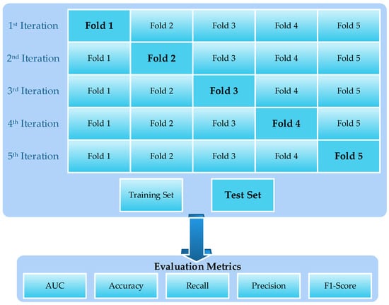 Figure 3 shows how stratified K-fold CV is used throughout the proposed approach in both stages. The data are randomly divided in each iteration, with 80% forming part of the training set and 20% forming part of the test set in a very organized manner, which does not lead to data leakage when training the model. The average value of the total of the 5 iterations is considered to be the final value when evaluating the model using evaluation metrics.