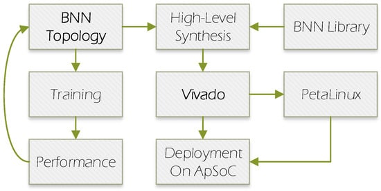 The first step is to design the typology, as it is the key factor to the performance. Given that training of BNN, similar to real-value network, relies on platforms with high computing capabilities, typologies are optimized on popular training platforms Pytorch and exported to network files manually. Then, the high-level synthesizer Vivado HLS 2019.1 compiles the network weight file and the BNN library into an intellectual property block that constitutes the hardware accelerator in Vivado developing kit. Following that, PetaLinux generates the Linux kernel and board support package for the accelerator and other peripherals. Finally, deployment also requires pre-processing and post-processing, which are handled by the processing system, as is shown in Figure 2.