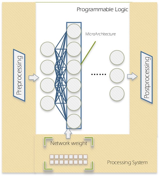 The FPGA platform can flexibly adjust its hardware units to different network structures [,,] because of their customized circuit structure. Furthermore, given that embedded applications require the support of numerous peripherals and operating systems, the industry has developed the APSoC, which unites traditional Central Processing Unit (CPU) cores and FPGA units. It can make full use of the merits of the CPU and FPGA to deploy a variety of embedded applications.