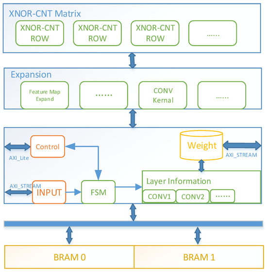 The hardware block diagram of the BNN FPGA accelerator core is shown in Figure 4 which is made up of four blocks: the feature map buffer, a Finite State Machine (FSM) controller, the expansion block, and an XNOR-CNT matrix. Each hardware block’s design and optimization approach are described in detail in this section.