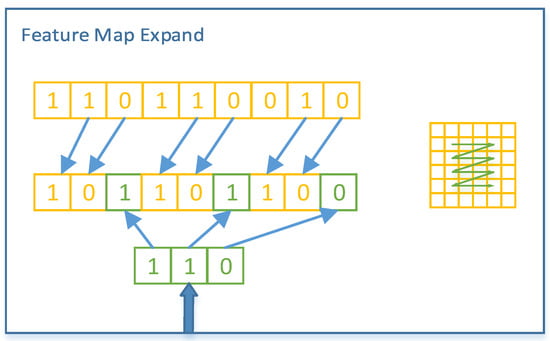 The Expansion Block converts the feature map and convolution kernel to binary vectors. The convolution kernel remains during this operation, while the local feature map vector is iterated according to its location. The sliding step of the convolution kernel is one unit in this project. The kernel scan feature map from left to right. When it moves one unit to the right, six of the nine feature vectors stay constant, but their storage location changes, while the other three feature vectors are replaced with new feature vectors from the feature map. When the convolution kernel realigns the first part of the row, it requires inputs three times to empty the data from the previous row, as shown in Figure 5. Thus, there is no need to supply extra bandwidth to transmit duplicate data throughout the sliding filtering process.