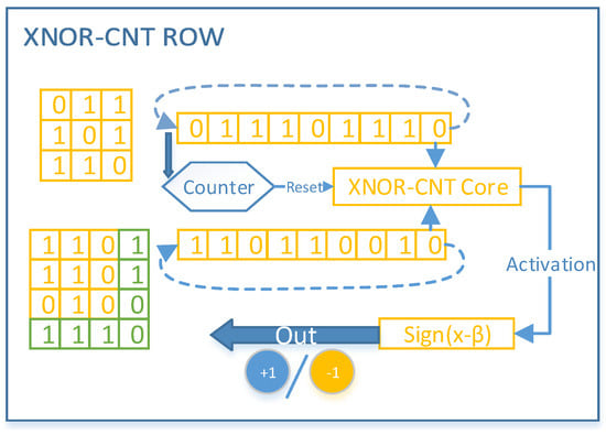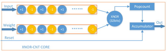 The XNOR-CNT Matrix is composed of N XNOR-CNT Rows, which are based on XNOR-CNT Core. XNOR-CNT Row is a fundamental binary convolutional unit that receives the feature vector, convolution kernel vector, activation threshold, and associated vector length from the Expansion Block, conducts an XNOR-popcount operation, and returns the activated results, as is shown in Figure 6. XNOR-CNT Core, as illustrated in the Figure 7, XNOR the input vectors first, and then unit count the set-bits in the output vector and holds it in the accumulator. In order to match the current mainstream computing architecture, the width of the XNOR-CNT Core is designed to be 32 bits.