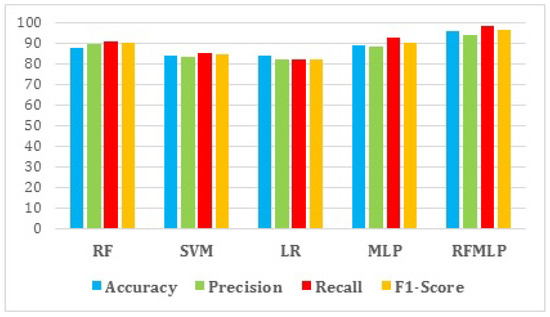 Table 9 presents the performance comparison of RF, SVM, LR, MLP, and RFMLP on all three datasets in terms of accuracy, precision, recall, and F1 score. For traditional models, deep learning-based MLP outperforms the other models in terms of all evaluation measures. However, the performance of the RFMLP is even better than the MLP which shows its significance.