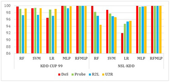 Figure 4 presents the performance comparison of all models in terms of accuracy on KDD-CUP 99 and NSL-KDD datasets which are the most commonly used datasets to validate the performance of intrusion detection approaches. It can be seen that the result of the proposed RFMLP surpassed the performance of other models. RFMLP shows accurate results for each category of attack including DoS, Probe, R2L, and U2R on the KDD-CUP 99 dataset and proves its good generalization ability.