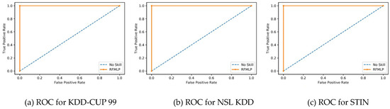 In addition to conventional performance metrics of accuracy, precision, recall, and F1 score, Mathews correlation coefficient (MCC) has been computed for RFMLP. The proposed model has shown a 0.99 score for MCC, which proves its robustness. Furthermore, the receiver operating curve (ROC) has been drawn for the proposed model. Figure 5 illustrates the ROC curve of the proposed model on KDD-Cup 99, NSL-KDD, and STIN datasets. The ROC curve also shows the superior performance of the proposed model on all three datasets.