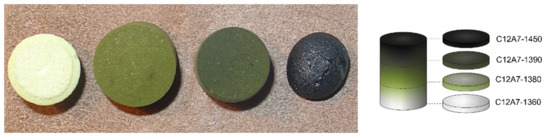 In this work, the method of synthesis of mayenite previously described in [18,19,20] was used. Aluminum hydroxide (Condea Pural SB—1, pseudo-boehmite, >99.9%) and calcium carbonate (Reachim, >99.97%) were used as starting materials for the synthesis. The first stage of the synthesis was to obtain CaO by decomposing CaCO3 in a muffle furnace in the air at 950 °C for 6 h. After that, the resulting CaO was added to a suspension of aluminum hydroxide in distilled water at room temperature with continuous stirring. The final ratio of the components corresponds to the stoichiometry of mayenite (12CaO·7Al2O3). The mixture was thoroughly stirred in distilled water for 10 h, filtered, and dried at 110 °C. Then, it was calcined in a muffle furnace in air at 500 °C for 6 h. The samples obtained were successively calcined in an Ar flow at high temperatures (>1300 °C). The initial sample C12A7-500 was heated at a rate of 3 °C/min, followed by holding at the specified temperature for 6 h. For characterization and investigation of electro-physical properties, a sample was taken at four temperature points: at 1360 °C, 1380 °C, 1390 °C, and 1450 °C. The appearance of the selected samples is shown in Figure 1, which in the future will be designated, respectively, as C12A7-1360 (white sample), C12A7-1380 (green), C12A7-1390 (dark green), and C12A7-1450 (black, electride).