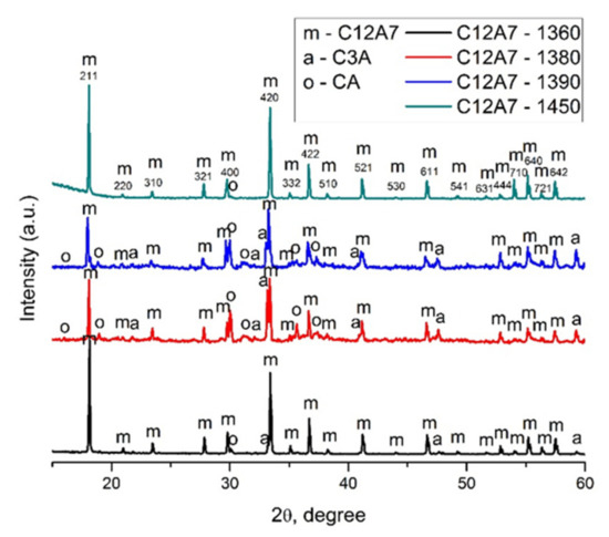 The lattice parameter of the mayenite phase (Table 1) slightly increases during these transformations from 11.998 to 12.004 Å. A gradual increase in the calcination temperature leads to the decomposition of the mayenite phase into phases C3A and CA, the content of which in the system is rather high. In the literature [28,29], it was indicated earlier that the process of oxygen release from the structure can be accompanied by rearrangements of the latter, with its stratification into aluminates of a different composition. Then, with a gradual increase in temperature in an inert atmosphere, an oxygen-deficient electride state C12A7:e− is formed. The increased value of the lattice parameter indicates the presence of oxygen vacancies at the crystallographic O3 positions, and, as a consequence, the presence of electrons in the unit cells of mayenite [30,31].