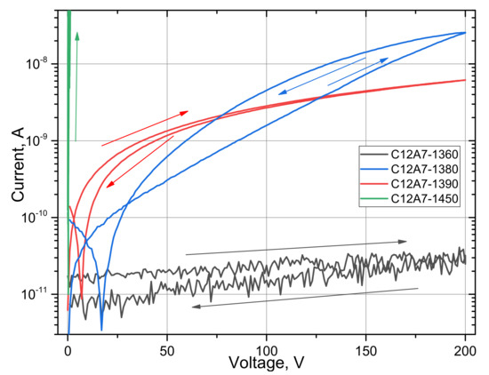 The I–V characteristics of all samples are shown in Figure 6. Three samples have shown hysteresis, which is characteristic of dielectrics. The currents for samples C12A7-1360, C12A7-1380, and C12A7-1390 are 3.2 × 10 −11 A, 2.5 × 10 −8 A, and 6.2 × 10 −9 A, respectively, at a voltage of 200 V. High voltages were not applied to the sample C12A7-1450 to preserve the integrity of the sample, although, an almost vertical I–V curve was observed. This indicates an exceedingly lower resistance of C12A7-1450 compared with other samples.