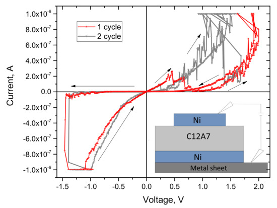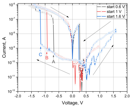 Figure 8 shows the I–V characteristics for the C12A7-1450 sample with three sweep cycles. The variable parameter in this group of measurements was the initial scanning voltage of 0.6 V, 1 V, and 1.6 V. At an initial point of 0.6 V, the switching voltage was –0.68 V, while at 1 V, the switching voltage was −0.92 V, and when the initial point was increased to 1.6 V, the switching voltage became −1.16 V (in Figure 8, the switching points are denoted as A, B, and C, respectively). Arrows indicate the direction of data measurement. Thus, Figure 8 illustrates the dependence of the switching voltage on the starting point. The switching voltage between the states (in terms of resistance) increases with an increase in the initial voltage.