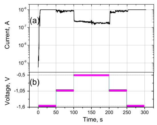 A study of the LR-state on-state current stability is represented in Figure 9. The measurements were carried out stepwise according to the scheme shown in Figure 9b. The current limit was 10−6 A. In the first few seconds (Figure 9a), there is a switch between off and on states. This sets the current corresponding to this voltage. Then, after 50 s, the voltage decreases in steps to −1.05 V and it is maintained at this value for the next 50 s. The current corresponding to this voltage also decreases and remains stable until the next voltage change of −0.5V. The current in the sections with a voltage of −1.05 V and −0.5 V is stable and corresponds to the current in the I–V characteristic in Figure 7 and Figure 8. Furthermore, the voltage also rises in steps to the initial value of −1.6V. As the voltage changes, the current also increases. Thus, this sample can operate in the mode of a switch with a nonlinear resistance.