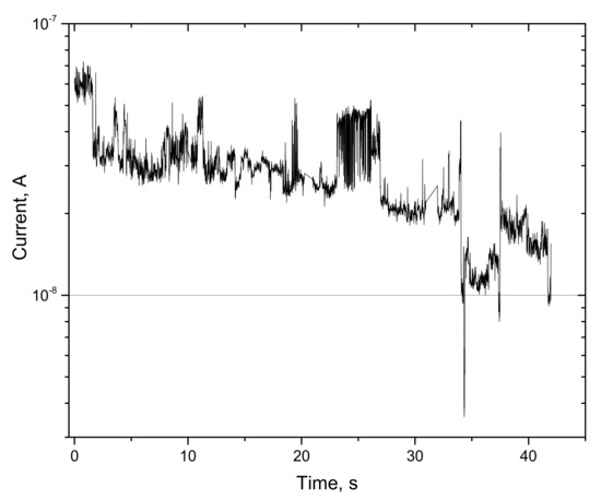 Furthermore, on-state storage studies were conducted in order to verify the memristor characteristic of C12A7-1450. Initially, the sample was switched to an LR state. After switching to a different state, the contacts on the sample were disconnected from the power supply for a few minutes (<10 min). Furthermore, the current dependence on time was measured (Figure 10) at a constant voltage of –0.5 V. When disconnected from the network current it was about 5 × 10 −8 A, which is much less than it should be on the I–V characteristic in Figure 9. The current decreased from 10−7 to 10−8 in a few minutes without a power supply. A decrease in the current indicates a very short storage time for the LR state and volatility, i.e., energy dependence, of the C12A7-1450 sample.