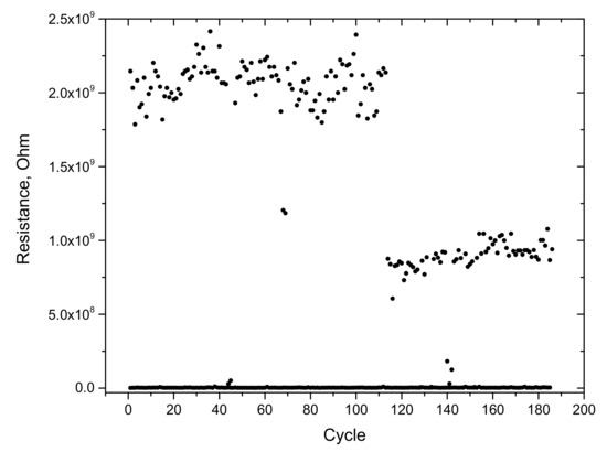 Figure 11 shows a study of the stability of switching between the states in terms of resistance. One switching cycle begins with a voltage pulse corresponding to the switch–off voltage. After that, at a given readout voltage, the current was measured, which corresponds to the off stage. Then, a voltage pulse was applied corresponding to the turn-on voltage. After that, at a given readout voltage, the current was measured, which corresponds to the turn-on stage. Furthermore, the switching cycles are repeated N times. The duration of the switching pulses was 100 ms, with a period of 500 ms. The amplitude of the two corresponding pulses was 1 and –1.6 V, respectively. The reading voltage was –0.5 V. In Figure 11, it is noticeable that the switching between states was relatively stable. However, one can notice several cycles that have not switched to a LR state. The resistances were in the order of 109 Ω in the off state and 5 × 10 6 Ω in the on state. In the other work on the study of bistable resistive switching of C12A7, cyclic switching was also investigated [17]. By comparing the data, it can be seen that the number of withstood cycles is higher [17]. Comparable dependencies were reported for other memristor materials [32].