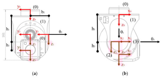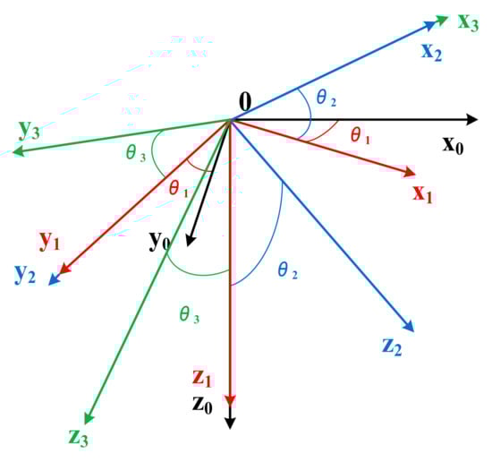 In this paper, it is assumed that the platform and the carrier are rigidly connected, that is, regardless of the damping effect between the platform base and the carrier. Therefore, the base coordinate system is considered to be the carrier coordinate system in the following analysis. As shown in Figure 1, the three-axis, three-frame gimbal stabilizer can be divided into vibration reduction system (defined as coordinate system 0), yaw frame (defined as coordinate system 1), pitch frame (defined as coordinate system 2), and roll frame (defined as the coordinate system 3) and other four parts, including the rotation angle of the yaw axis, the rotation angle of the tilt axis, the rotation angle of the roll axis, and the distance from the center point of the pitch frame to the motor of the roll frame. The distance is the vertical distance from the center point of the pitch frame to the position where the sensor is placed in the roll frame and the horizontal distance from the left end of the lower damping plate to the coordinate system (0). The structure is connected by three rotating joints, and each joint is driven by a motor; the yaw axis motion, pitch axis motion, and roll axis motion are controlled separately. When the carrier is vibrated or tilted by the external environment, the inertial measurement unit (IMU) installed on the rolling frame obtains the frame deviation. After calculation by the control algorithm, it outputs a compensation signal to drive the motor to generate a balanced torque so that the stabilizer eliminates deviation and maintains the horizontal stability of the boresight.
