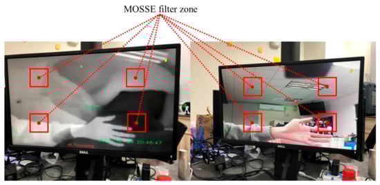 In this study, the image captured by the optical payload is used to perform the MOSSE filtering on the pixels between 100 × 100 pixels at the position of four points in three-quarters of a pixel, as shown in Figure 3. The four point positions averaged the ideal sight center coordinates of the previous frame that was displaced due to the shock and averaged the position information of this shock and the feed-forward value in the motion control card to the position information of the next frame. The ability to approach real-time control is very high, so MOSSE is used for tracking and identification.