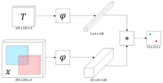 The parameter of denotes a signal that takes value in all locations. The parameter is the feature extractor in the SiamFC. The function of is the correlation operation and is represented as the response map. The score means the similarity between the image template and the searching region. The position with maximum value in corresponds to the location of the target. In order to realize real-time tracking, the feature extractor is usually used based on a convolutional neural network such as AlexNet [10].