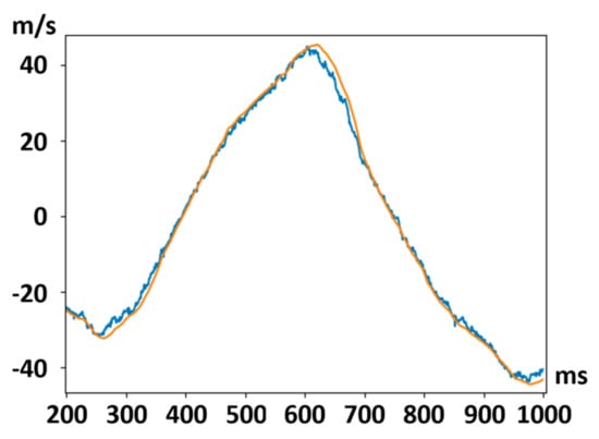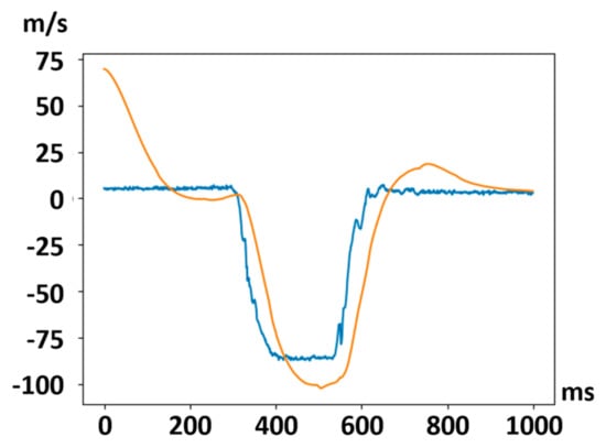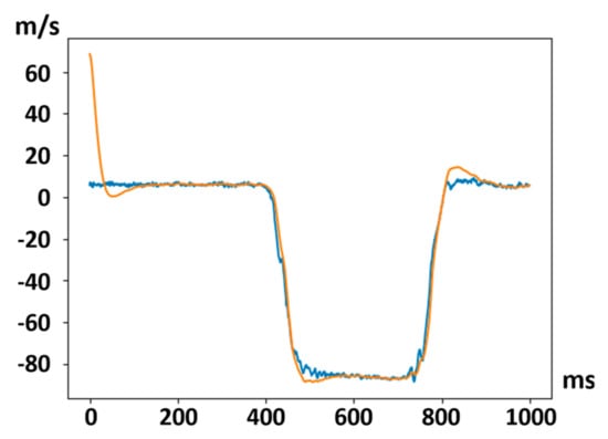Figure 9 shows the result with the analog input of a straight-up and EKF of one layer. The input signal source is a blue line, and the output signal with EKF is an orange line. The output image is 54 fps per frame, while the average power consumption of the body system is 4.321 W.