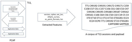 Figure 1 shows the steps from feature extraction to building a corpus. The single box is a TLS session with two payloads from a PCAP file with a right arrow representing a client’s packet and a left arrow representing a server’s packet with features. The first two arrows in the left box are handshakes while the rest represent TCP Application Data, which we call payload. We collected zero to a total of two or more payloads from each client and server. Multiple TLS sessions exist in the PCAP file with the symbol of TLSt. The arrow in the middle represents the features that are being extracted to a corpus. The document symbol on the right represents a corpus containing a TLS handshake and two payloads from the features.