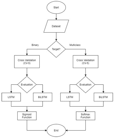 Two types of Recurrent Neural Network (RNN) were used to evaluate the performance: Long Short-Term Memory (LSTM) and Bidirectional LSTM (BiLSTM). LSTM and BiLSTM have a specialty of their effectiveness in memorizing particular patterns. At the same time, both algorithms are suitable for detecting malicious traffic with payloads [,].