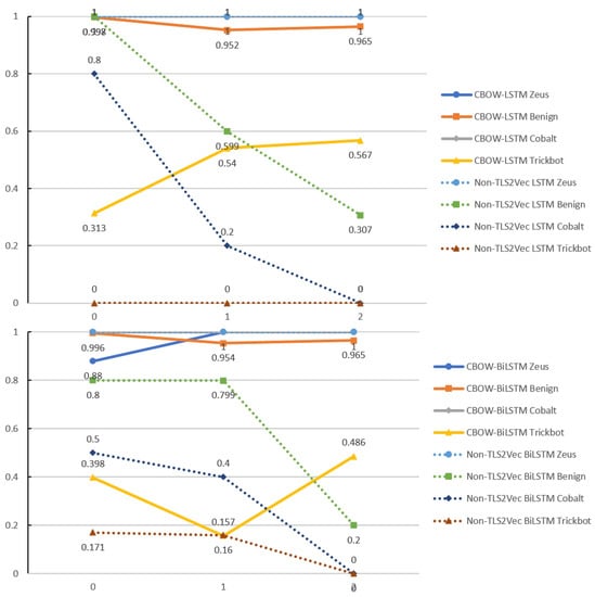 This section evaluates the performance of the TLS2Vec by performing with binary and multiclass targets. We grouped three malicious traffic from the Zeus, Cobalt, and Trickbot into a single class Malicious for the binary target. The total number of TLS sessions of Malicious traffic was 10,163 after grouping. The considered evaluation used 5-fold cross-validation (CV-5). Note that an imbalance of data distribution exists in this dataset. We used both the categorical_crossentropy and binary_crossentropy for the loss function. The Adam optimizer was applied with a learning rate of 0.001. The rest of the hyper-parameters used their default values. The softmax was used for the activation function for categorical_crossentropy, while sigmoid was used for binary_crossentropy. Figure 2 illustrates the evaluation procedure. Table 2 provides the hyper-parameters regarding detection based on LSTM and BiLSTM.