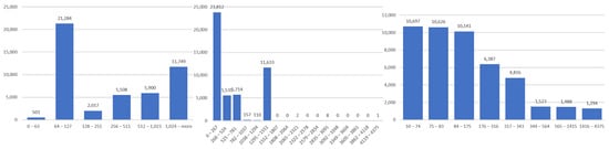 The problem in the discretization was selecting the intervals or bins. We used two different methods for selecting the number of bins: bit-length, which we called Bit-Width, and the Sturges rule, used for constructing histogram and non-stationary data []. For the Bit-Width (BW), we used intervals from 0 to 63, 64 to 127, 128 to 255, 256 to 511, 512 to 1023, and 1024 or more. The payload in the intervals of six categories will be converted according to the bins. For the Sturges rule, we used two different combinations called Sturges-EqualWidth (SEW) and Sturges-EqualFreq (SEF). SEW ensured each bin has an equal range of the original value, while with SEF, each bin has the same number of samples. For SEW and SEF, selecting a number of bins followed the Sturges rule for only one payload. The bins range results from one payload then applied to the payload two or more.