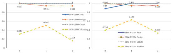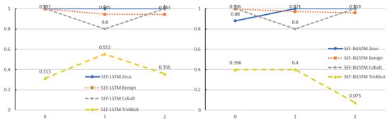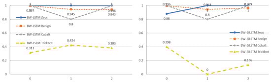 Notice that during the binning process with SEW, we found that several bins had zero members (see Figure 5). The results were due to SEW’s nature, which groups members by their equal range. From this point, if the bin’s range was zero, no payload exists within the range. In the subsequent evaluation, we started with implementing BW, SEW, and SEF and then evaluated all four classes. Figure 6, Figure 7 and Figure 8 show the results of the multiclass target using LSTM and BiLSTM with BW, SEW, and SEF, respectively.