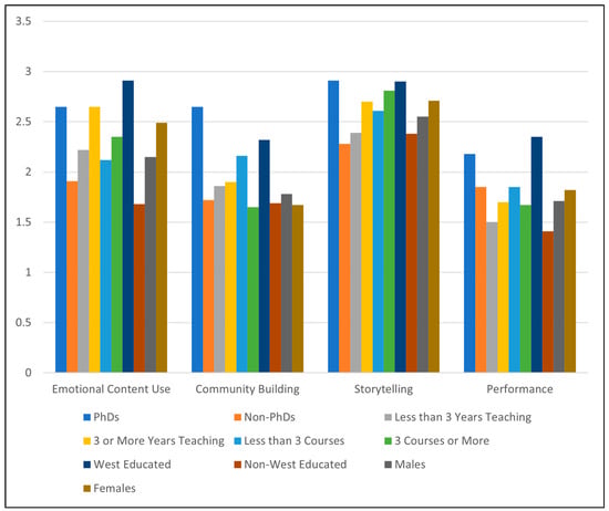 The third row in Table 5 showcases the means of digital storytelling utilization by faculty at Najran University’s computer science/information systems departments during COVID-19 online learning. Note that most means are below 3, indicating a low utilization of digital storytelling techniques throughout virtual lectures. Ph.D. holders who graduated from Western universities and colleges exhibited the highest level of digital storytelling. Lectures without doctoral degrees who obtained their diplomas from non-Western institutions demonstrated the lowest use of digital storytelling. The general theme across the departments is that faculty do not utilize storytelling as a main technique in their online teaching.
