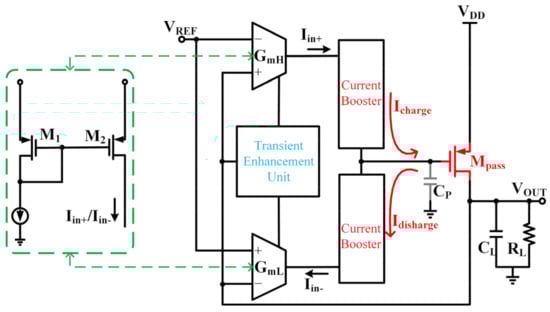 Figure 1 shows the conceptual schematic of the proposed fast transient OCL-LDO. The OCL-LDO consists of a high slew-rate error amplifier and a pass element Mpass. The capacitor CP represents the gate parasitic capacitor of the power transistor. Gm cells, the proposed transient enhancement unit (TEU) and the current booster (CB) construct the high slew-rate error amplifier. The TEU and the CB consume a low quiescent current at steady state. The TEU senses the output variation and transfers it to a transient bias current of Gm cells during the load current transitions. Consequently, Iin+ decreases and Iin− increases rapidly. Then, Iin− will be boosted several times to quickly discharge Cp through the current booster. Thus, a fast transient response can be achieved. The circuit implements and considerations will be discussed in detail in the following subsections.