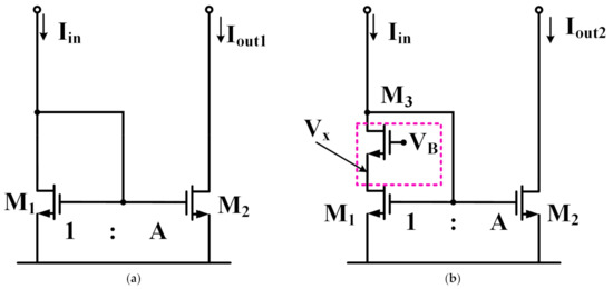 Current mirrors are widely used in Class-AB OTA topologies [27]. Figure 4a illustrates the classical current mirror structure. M1 and M2 are both in the saturation region, and the ratio of the output current Iout1 to the input current Iin1 is equal to the scale factor A.