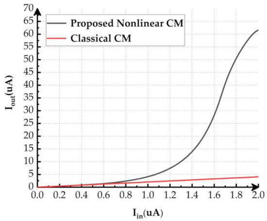 Figure 5 shows the simulated dc responses of the traditional current mirror and the nonlinear current mirror at A = 2. If the bias voltage VB is biased properly to make M1 near the ohmic region, the output current will boost as Iin increases, even with a small scale factor.