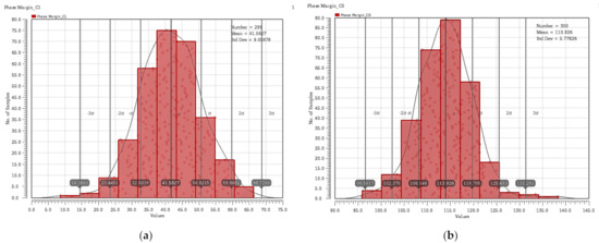 (a) Monte Carlo simulation results of the phase margin with Iload = 10 μA and CL = 100 pF; (b) Monte Carlo simulation results of the phase margin with Iload = 100 mA and CL = 100 pF.
