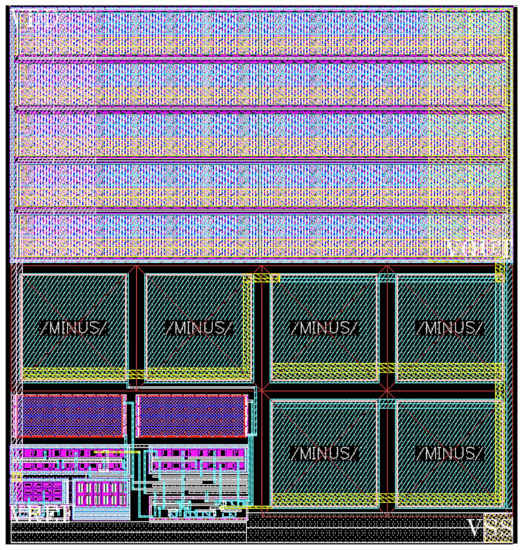 The nonlinear current mirror structure is applied to maintain a low quiescent current and boost the output current when Iin increases. Figure 4b shows that the nonlinear current mirror is implemented by adding transistor M3. The bias voltage VB is set to ensure that the transistor M1 operates near the ohmic region, i.e., VDS is slightly higher than VDS,sat. Vx will decrease when Iin increases due to the fixed bias voltage VB. Hence, the drain-source voltage of M1 is lower than its VDS,sat, which will drive it to the ohmic region. The current boosting is realized as long as M2 is in the saturation region. Because the VDS is low, the drain-source voltage of M1 can be approximately expressed as: