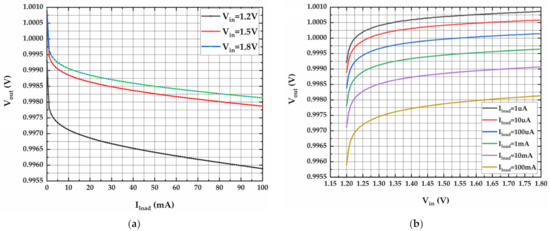 The input voltage range of the proposed OCL-LDO is designed from 1.2 to 1.8 V. The LDO is capable of delivering a current of 100 mA with a dropout voltage of 0.2 V. It is stable when output capacitor values range from 0 to 100 pF. In addition, the OCL-LDO consumes small quiescent current of 10.3 μA and the current efficiency can reach 99.99%. The load regulation is simulated for Vin = 1.2 V, Vin = 1.5 V, and Vin = 1.8 V when VOUT = 1 V with a 100 pF output capacitor. The line regulation is simulated for different load currents (from 1 μA to 100 mA) when VOUT = 1 V. As shown in Figure 11a,b, the load regulation and line regulation are 34 μV/mA and 2.74 mV/V, respectively.