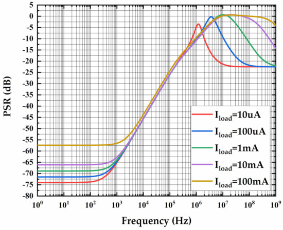 The power supply rejection (PSR) was simulated by adding a sinusoidal signal to a dc input voltage of 1.2 V and observing the output [26]. Figure 12 depicts the PSR of the OCL-LDO under different load currents when VIN = 1.2 V and Vout = 1.0 V.