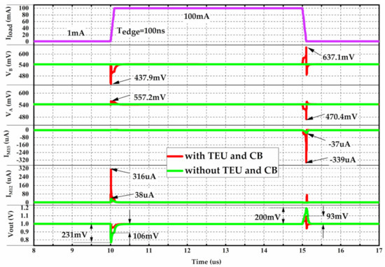 Simulated load transient response of the OCL–LDO with/without TEU and CB.
