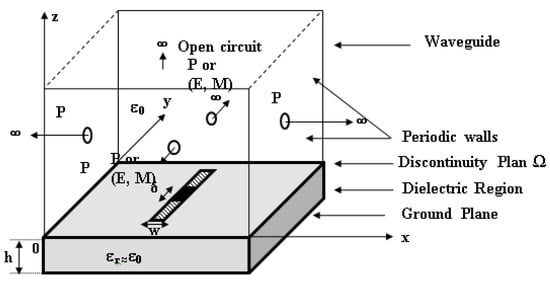 Therefore, the relation of the total near-field distribution set on the surface of the discontinuity (rectangular opening aperture) (metal form + dielectric substrate) of the global almost periodic structures can be defined according to the Galerkin procedure as follows [4,37,38,39]: