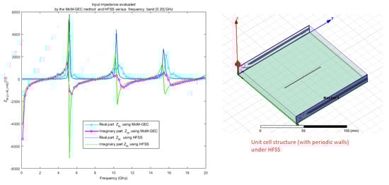 Validation of the evaluated input impedance obtained by the MoM-GEC and the HFSS tool for a unit cell of a dipole: rad m, rad m, mm mm mm mm mm (at the fixed frequency f = 5.4 GHz mm, and (air).