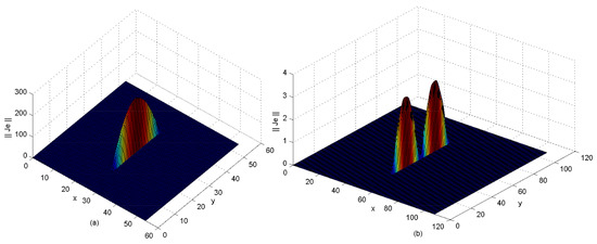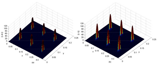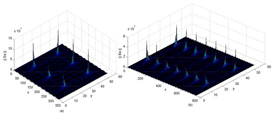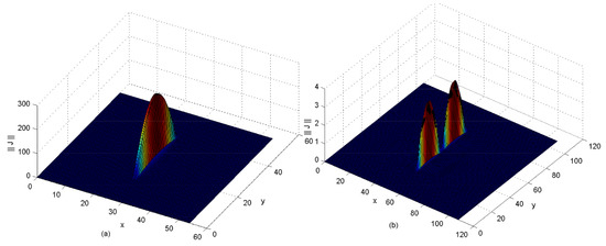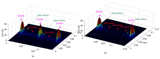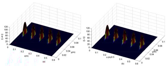 Current densities: examples of 1D aperiodic arrays (half-wave dipoles) that appeared on the guide wave’s aperture, described by the basis functions (Guide’s modes) (without convergence) at the operating frequency (f) of 5.4 GHz: (a) for an aperiodic exitation of type 10101, (b) for an aperiodic exitation type 10001. The physical parameters were: rad m, rad m, mm, mm mm, mm, mm, mm, and (air).