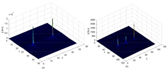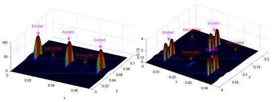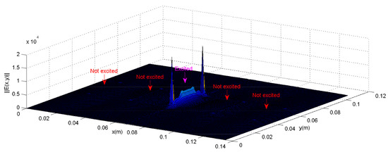 Identically, the 1D and 2D quasi-periodic structures will follow the same pattern when representing the current and electric fields, as indicated in Figure 13, Figure 14, Figure 15, Figure 16 and Figure 17. It is shown that the electromagnetic coupling is expressed by the lying of a weak current surface on the non-exciting elements of the aperiodic configuration (which explains also the phenomenon of leaky waves). As shown in Figure 14, a Gibbs effect appears when the guide’s modes number has not correctly reached the convergence level.