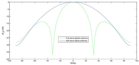 Radiation pattern calculated using the MoM-GEC method for a half-wave and full-wave dipole antenna: f = 5.4 GHz, rad m, rad m, mm, mm mm, mm. (Blue color) mm; (Green color) mm, mm, and (air).