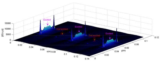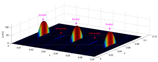 In this way, the preceding case of the basic element should be generalized to an almost periodic array configuration [2,3,37,38,39]. Thus, based on the formulation problem detailed in [2,3], the electromagnetic fields (E, J) of the whole structure can be shown. Thus, Figure 10, Figure 11 and Figure 12 allow one to verify all the proposed boundary conditions in terms of current and electric fields associated with the periodic planar structure.