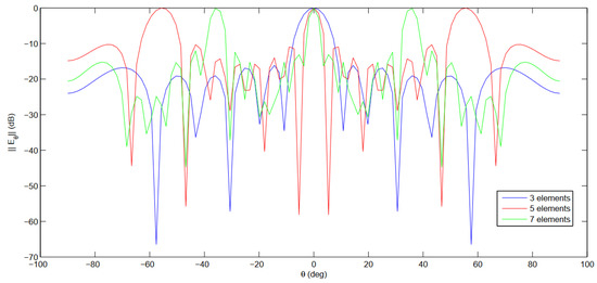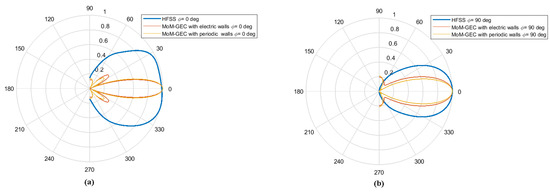 Electric field of the almost periodic array (half-wave dipoles) defined by the waveguide’s aperture, described by the basis functions (guide’s modes) using (a) three cells or (b) seven cells at the operating frequency (f) of 5.4 GHz. The physical parameters were: rad m, rad m, mm, mm mm, mm, mm, mm, and (air) (see [1] for a comparison).