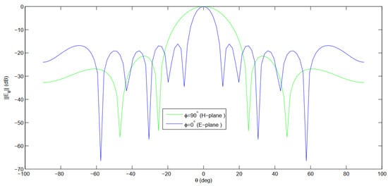 This section shows the main expression of the radiation pattern related to the proposed almost periodic planar structures (see Figure 1 for the periodic antenna array example) [37,38,39], which was discussed in our previous work [2,3,5]. To extract such a radiation pattern, it is claimed that an integral method based on the method of moments combined with the generalized equivalent circuit (MoM-GEC) [37,38,40] should be implemented.