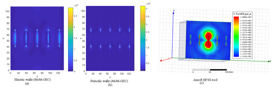 Distribution of the electric density for () aperiodic phased half-wavelength planar dipoles (with (0,0,1,0,0) voltage configuration) described with the basis functions (guide’s modes) at f = 5.4 GHz (using EEEE electric walls).