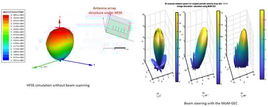 In previous work, we studied the convergence level of the input impedance and the current distributions as functions of the guide’s modes and the trial functions, to demonstrate the coupling terms of the almost periodic array [2,3]. This study focused essentially on creating the radiation pattern associated with the planar almost periodic structures [37,38,39]. First, the electromagnetic states in electric and current fields of the proposed configuration examples must be taken, which are present at the waveguide aperture. Then, the desired radiation pattern (or the electric far-field) can be computed using the main Fourier expression written and explained in the previous Section [4,37,38,39], where the near field distribution defined on the discontinuity plane is weighted by a numerical MoM-GEC formulation [2,3,5]. To validate the structure, a comparison curve between the MoM-GEC and HFSS tool is presented in terms of input impedance, as shown in Figure 5.