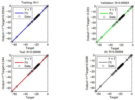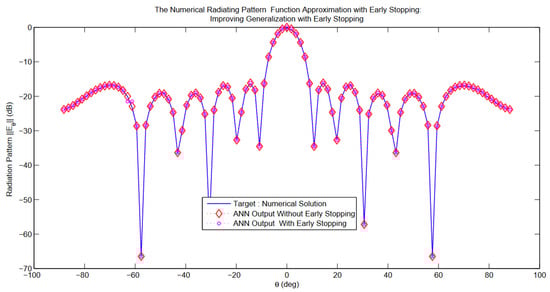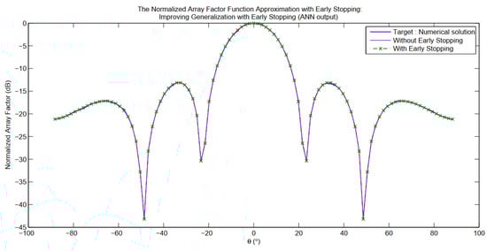In this work, the Levenberg–Marquardt minimization algorithm (LMA) was used to train the ANN. The accuracy of its models was evaluated by the mean sum of squared error (MSE) between the calculated (desired) radiation pattern obtained using numerical analysis and the predicted values for the training dataset [15]. We executed a linear regression between the network outputs and the corresponding targets [50].