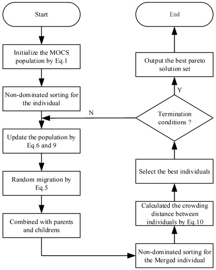 The cuckoo search (CS) algorithm is a kind of natural heuristic algorithm by analyzing the parasitic behavior of cuckoo brood and including the Levy flight behavior of birds. The female cuckoo will find the best nest and lay multiple eggs into it by the Levy flight mechanism, and the host bird will inadvertently incubate cuckoo chicks. If the host bird finds an alien bird’s egg in the nest, it will kick out the egg or discard the current nest, build a new nest, and start breeding its own chicks. Hence, the parasitic reproduction strategy is employed in the CS method to find the optimal solution. In the implementation processing of the CS algorithm, the location of cuckoo’s parasitic nests will be mapped to the solution in the population space, and the advantages and disadvantages of the location of the parasitic nest will be designed as the optimal fitness value to evaluate the solution. The MOCS is proposed to further broaden the application field of CS from single-objective problem optimization to MOP solving, while preserving the population renewal strategy using Levy flight and the principle of discovery probability.