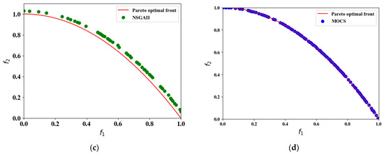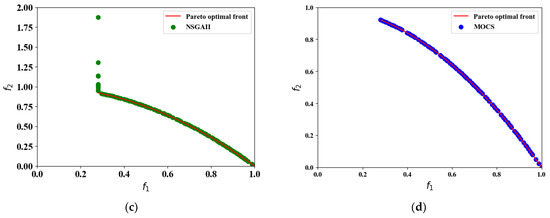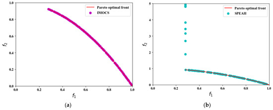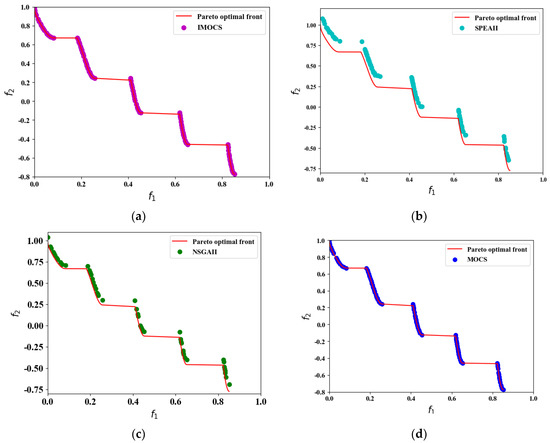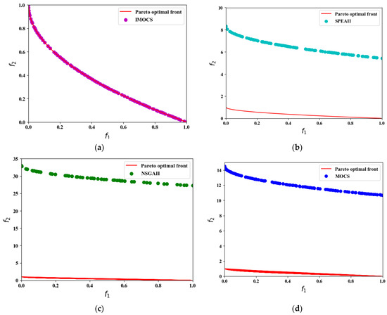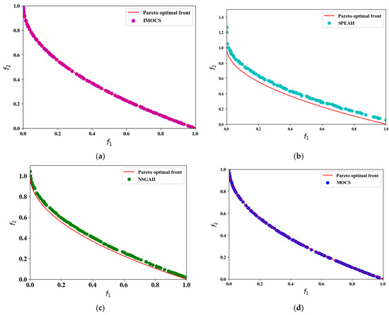 Focusing on the ZDT4, all evaluation indicators can obtain the best solution. It is difficult to find the global optimal Pareto front for algorithms with weak adaptive ability and weak external disturbance ability because the ZDT4 contains 219 different local optimal Pareto fronts in the search domain. Therefore, the MOCS, NSGAII, and SPEAII are stuck in different local Pareto fronts when iterating 1000 times and cannot jump out of the local extremes. Although the ZDT6 has a non-uniform search domain, it can be seen from the evaluation data of GD, IGD, and HV that the IMOCS algorithm can obtain the best non-inferior solution in terms of convergence and solution density. In contrast, the MOCS obtains non-inferior solutions in solution density indicators (IGD, HV), followed by the IMOCS, SPEAII, and NSGAII.