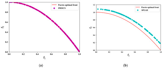 According to Equations (12) and (13), the smaller the IGD value, the closer the non-dominated solution obtained by the algorithm is to the true Pareto front, the better the convergence of the algorithm, and the better the diversity of the non-dominated solution set. It can be found that the GD method can only evaluate the convergence of the algorithm, while the IGD can evaluate the convergence and diversity at the same time, and the calculation cost is small. The disadvantage is that a reference set is required.