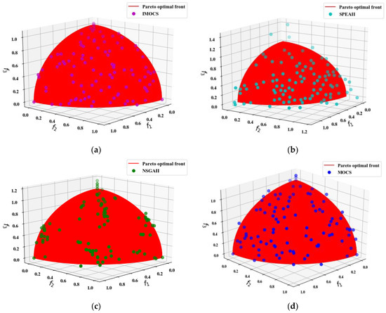 For the optimization DTLZ4 problem, the convergence and diversity indicators of the four algorithms are evaluated. As shown in the statistical results in Table 3, Table 4 and Table 5, the non-inferior solution obtained by the NSGAII in the GD indicator is smaller than that of IMOCS, and then its convergence is better than the IMOCS. However, the comprehensive evaluation of indicators (such as IGD and HV) shows that the diversity of non-inferior solutions of the NSGAII is far worse than the IMOCS. Therefore, when NSGAII addresses the high-dimensional and complex DTLZ4 problems, most solutions are closely distributed in a small area at the bottom of the true PF surface. As a result, the GD indicator is considered to coincide with the true Pareto frontier in evaluating the convergence, which leads to its convergence in the GD indicator being better than other algorithms. Second, in Table 4 and Table 5, IMOCS is far superior to the other three algorithms in both convergence and diversity evaluation, and the ranking remains the first, while the MOCS ranks the second and SPEAII and NSGAII are the third and fourth position, respectively.